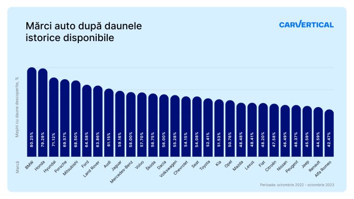 Metodologie Cercetarea carVertical a examinat rapoartele reale de istoric auto dobândite de utilizatorii companiei din octombrie 2022 până în octombrie 2023. Deteriorările enumerate în aceste rapoarte au fost agregate după mărci de mașini, analizate, transformate în procente și clasificate. Procesarea a milioane de verificări ale istoricului auto permite companiei să observe tendințe, insights și prognoze ale piețelor auto second-hand.