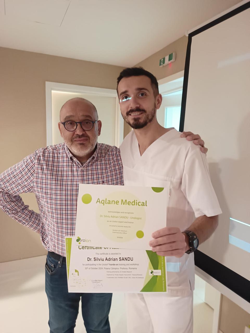 Un moment important al evenimentului a fost prezența unui invitat special de renume internațional, profesorul urolog Andelo Mojsovic din Croația, membru al Societății Internaționale de Continență. După finalizarea intervențiilor medicale, dr. Silviu Sandu a primit certificarea oficială ca trainer pentru injectările transuretrale cu UROLON, confirmând astfel expertiza și competențele sale în utilizarea acestui tratament inovator.